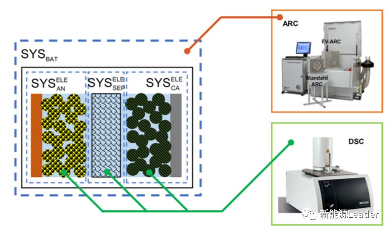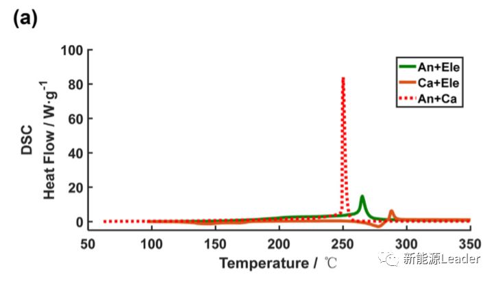 为了能够分析锂离子电池热失控过程中热量主要来源,作者设计了如下图所示的模型,也就是将锂离子电池分解为正极+电解液,负极+电解液和隔膜+电解液三个部分,然后分别采用DSC设备来进行监测。
