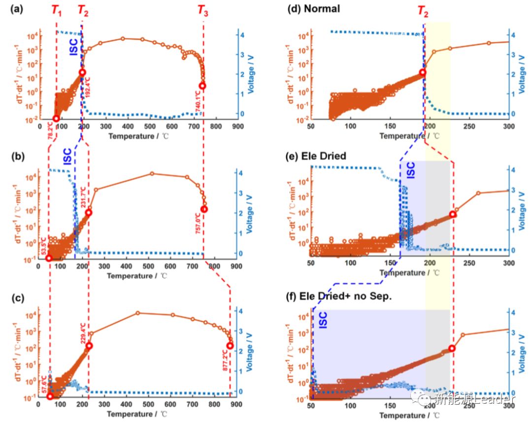 对于T2-T3温度范围内电池额外热量来源的另外一种解释认为可能是由于T2温度以后电池发生内短路,短路点的大电流放热产生这一过程中额外的热量,对这一假设作者也进行了验证。作者对比了普通电池、电解液蒸干电池和电解液蒸干并去除隔膜电池的ARC曲线,从下图b电池的电压能够看到大约在175℃时电池发生短路,但是由于电池内部缺少电解液,因此短路并没有造成电池温度显著升高,而到了231.7℃时由于正负极的氧化还原反应才导致电池温度快速升高。最终电池达到的最高温度T3与普通电池基本一致,这也表明短路产生的热量并不是导致NCM电池在T2-T3温度范围内电池温度升高的原因。