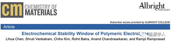 电化学稳定窗口是在锂离子电池中选择聚合物作为固体电解质的一个基本考虑因素。聚合物基体的形态和化学特性以及它与锂盐之间复杂的相互作用使得难以通过计算或实验来估算其电化学稳定窗口。为此,美国佐治亚理工学院材料科学与工程学院Rampi Ramprasad等人提出了一个实用的计算程序来估算电化学稳定窗口,采用第一性原理密度泛函理论计算仅有一个主导因素(即聚合物基体)来估计电化学稳定窗口。系统研究了十种不同的模型聚合物,如聚乙烯、聚酮、聚乙烯氧化物、聚丙烯氧化物、聚乙烯醇、聚己内酯、聚甲基丙烯酸甲酯、聚甲基丙烯酸甲酯、聚氯乙烯和聚偏氟乙烯。对于每一个例子,考虑较复杂的分级模型结构来阐明聚合物化学和形态复杂性对电化学稳定窗口的影响。计算结果与实验值可以较好的吻合,为计算过程的提供了可靠的依据。此外,本研究为后续系统研究其他因素的影响(例如锂盐和电解质界面的存在)提供了基础。因此,本工作为合理设计具有理想电化学窗口的新型聚合物电解质的发展迈出重要的一步。(DOI: 10.1021/acs.chemmater.9b01553)