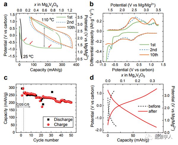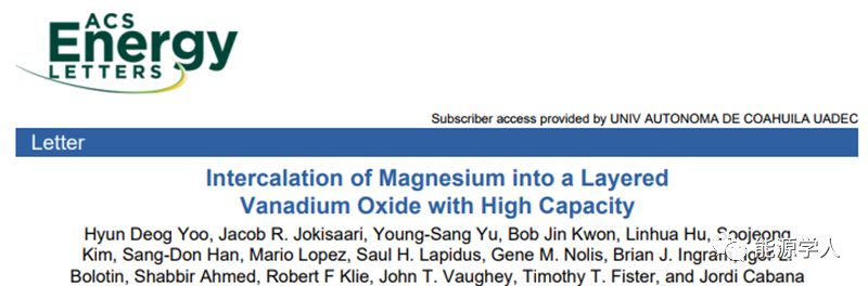 虽然α-V2O5传统上被认为是一种有望在高电位下可逆嵌入Mg2+的氧化物,但最近的报道表明,以前观察到的电化学活性主要由H+所决定而不是Mg2+的嵌入,即使在非水电解质中也是如此。因此,氧化物嵌入Mg2+的固有功能仍然存在问题。近日,伊利诺斯大学芝加哥分校化学系 Jordi Cabana等人通过在化学和阳极稳定的离子液体电解质中进行电化学测试,发现在110℃时层状α-V2O5确实能够在一个单元内可逆地嵌入1mol Mg2+,比容量超过280mAh/g。通过元素探测多模态表征证实了Mg2+的嵌入,以及氧化还原和氧化物所经历的形态变化。经过110℃下的循环后,其室温下的电化学活性明显增强。这一结果证明功能性镁可充电电池可超过目前锂离子电池的能量密度标准。(DOI:10.1021/acsenergylett.9b00788)