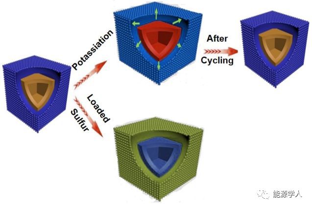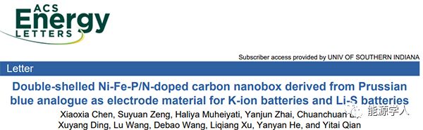 设计合理、制作方便、应用广泛、结构清晰、成分多样的双壳空心结构作为可充电电池的电极仍是一个巨大的挑战。近日,山东大学化学与化工学院徐立强教授等人合成了双壳层Ni-Fe-P/N掺杂碳纳米盒(Ni-Fe-P/NC),并将其作为钾离子电池(KIBs)和锂硫电池的电极材料。独特的结构不仅可以减轻循环过程中Ni-Fe-P/NC的体积变化、防止团聚,而且可以为电解液的渗透提供有效的表面积。此外,氮掺杂碳可以提高电极的电导率。因此,当其作为钾离子电池的阳极材料时,表现出优异的循环稳定性(在500mA/g电流密度下1600次循环后具有172.9mAh/g容量和在1000mA/g电流密度下1000次循环后115mAh/g的容量)。同时,Ni-Fe-P/NC由于其独特的中空结构,可以承受高硫含量的负荷,对多硫化物具有较强的化学吸附能力,也可作为锂硫电池的硫载体材料。(DOI:10.1021/acsenergylett.9b00573)