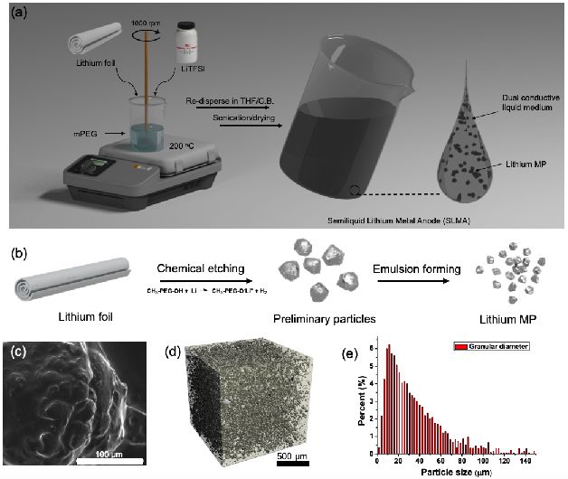 1. 通过反应性高分子表面活性剂和锂金属的乳化作用制备了由锂微米颗粒,液态聚合物离子导体和碳黑构成的锂含量为40%的半液态锂金属负极(SLMA)复合材料。
