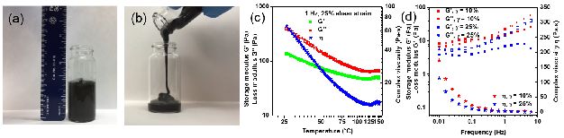 图3. (a)大约15 g复合电极材料SLMA实物图。(b)复合电极SLMA于120 oC呈流体状从容器中倒出。(c)&(d)复合电极材料SLMA在不同温度和频率下的剪切模量与粘度变化。