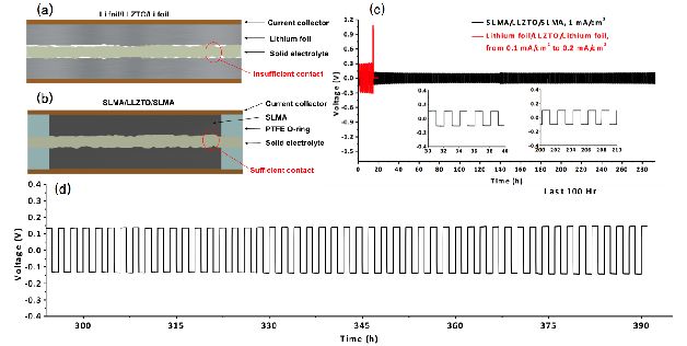 2. SLMA消除了传统锂片与陶瓷电解质存在的界面接触问题;锂剥离/沉积发生在整个三维结构内部;具有体积变化自适性。