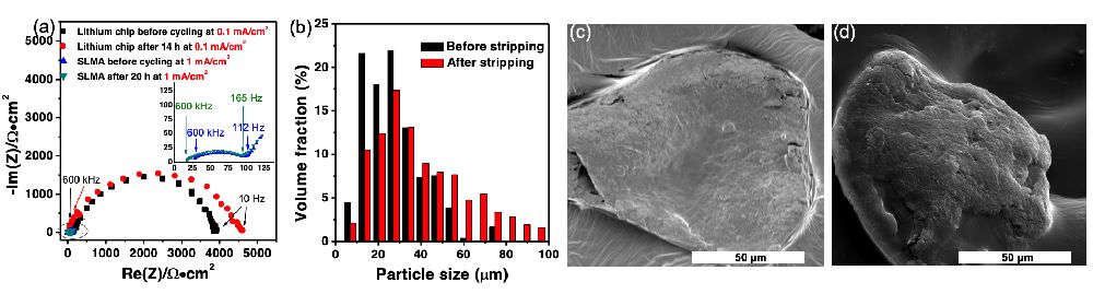 图5. (a)对称电池的电化学阻抗谱。(b)SLMA在电化学剥离前后的锂微米颗粒粒径变化。(c)&(d)锂微米颗粒在电化学沉积前后的表面SEM图。