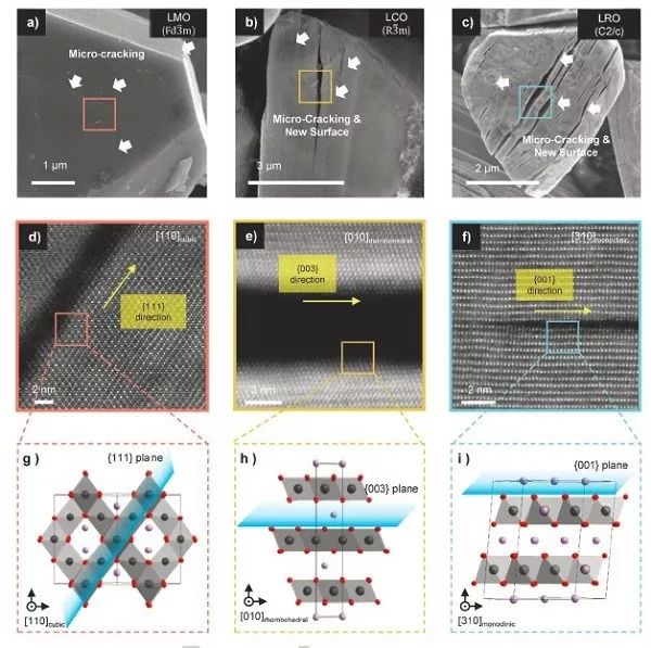 图1 (a)LMO,(b)LCO和(d)LRO单晶微裂纹形成方向的SEM图。(d-f)微裂纹区域放大的高角暗场像-扫描投射显微镜(HAADF-STEM)图。(g-i)(d-f)中方框所示区域放大的原子结构。蓝色块代表微裂纹平面,Li、Mn和O原子分别为紫色、深灰和红色。