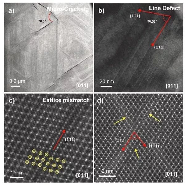 以LMO为例,其在扣式半电池中循环100周后的横截面如图2(a)所示,能清晰观察到特定取向的微裂纹以及一些线缺陷。更有趣的发现是,这些线缺陷和微裂纹是同向的,由此可以想见两者的出现紧密相关。通过高分辨率STEM分析,两个线缺陷沿(11-1)和(-11-1)晶面排列,呈大约70.5°角(图2(b))。图2(c)高角环形暗场图(HAADF)显示线缺陷区域附近,沿缺陷方向的众多{111}晶面点之间有额外的点阵出现,表明此处有晶格错配现象发生。图2(d)中晶格错配线上还能观察到其他类型的缺陷如Mn离子位移等。这些晶格错配导致界面处有离子和电子性能的突变,会伴随着LMO单晶中平面两侧不同的电化学反应。由此,在充放电过程中界面将聚集大量的应变和应力,最终引起微裂纹形成。
