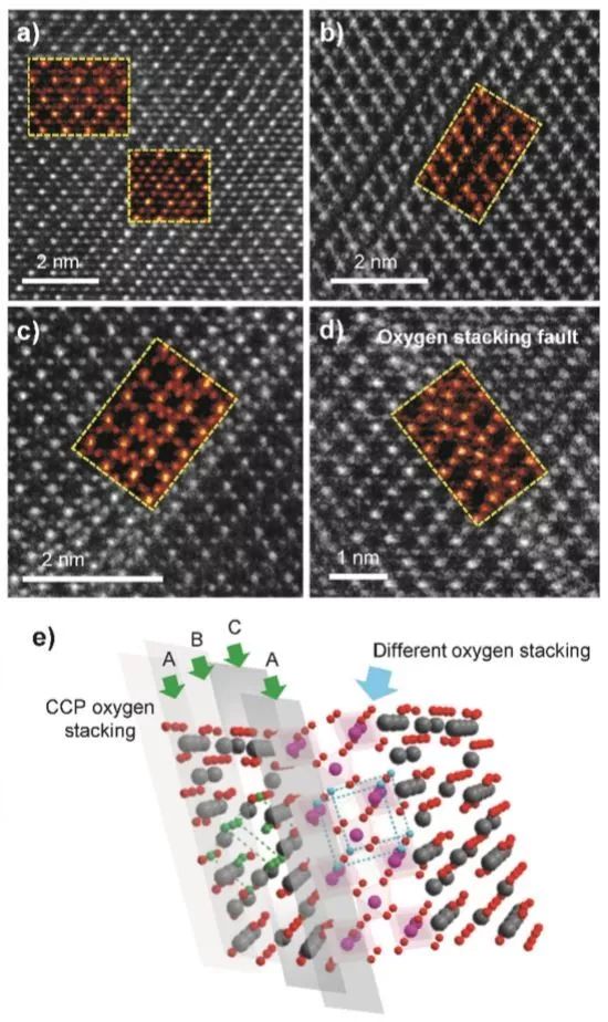 图3(a-d)电化学循环后{111}方向复杂结构转变的HAADF-STEM图,转变的结构用黄色虚线框标出。(e)HAADF-STEM图(d)的结构示意图。