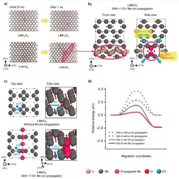 图4 (a)尖晶石LMO和λ-MnO2原始态和1 ns后的分子动力学(MD)模拟(0.025%的OVs)。(b)正交超晶胞示意图,显示了Mn离子<110>传输路径和晶面膨胀。(c)密度泛函理论(DFT)计算的不含和含有Mn离子<110>传输路径的正交超晶胞的OV迁移模型系统(路径A和路径B)。(d)DFT迁移模型系统中通过路径A和路径B迁移的能垒值。