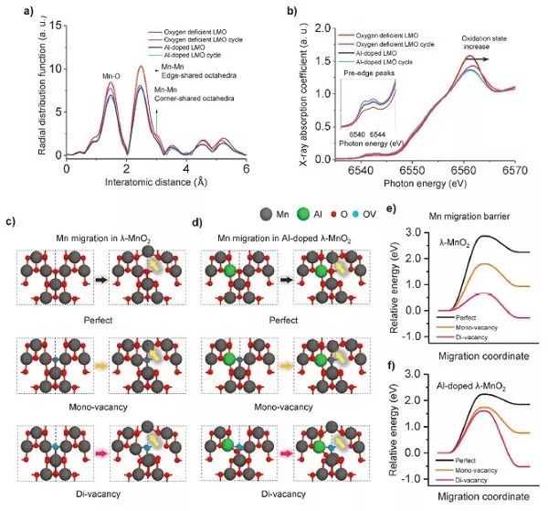 图5 (a)Mn的K边径向分布函数(RDF)曲线。(b)电化学循环后缺氧LMO和Al掺杂LMO的Mn元素K边X射线近边吸收谱(XANES)。(c)λ-MnO2和(d)Al掺杂λ-MnO2内Mn离子迁移路径模型(无空位、单空位和双空位)。(e)λ-MnO2和(f)Al掺杂λ-MnO2内Mn离子迁移的能垒图。