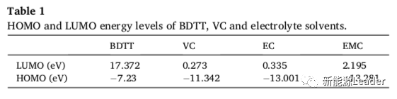 几种电解液添加剂的分子轨道能量如下表所示,其中LUMO为最低未占用轨道能量,能量越低越容易被还原,HOMO为最高占用轨道能量,能量越高越容易被氧化,从表中能够看到VC和EC的LUMO都比较低,因此更容易在负极表面发生还原,而BDTT的LUMO能量较高,因此基本不会在负极表面发生还原,但是BDTT的HOMO能量是最高的,因此更容易在正极发生氧化。
