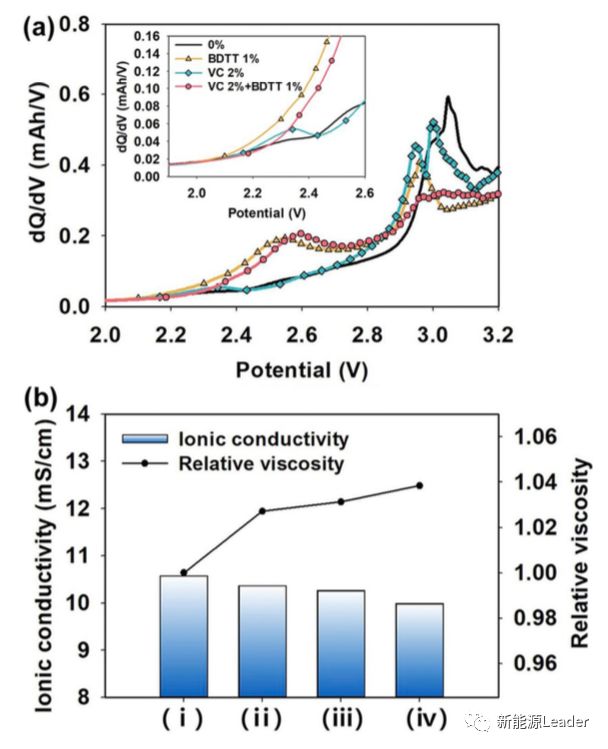 从下图b可以看到在电解液添加添加剂后电解液的电导率有所降低,但是基本都在10mS/cm左右,满足应用需求,同时加入添加剂后电解液的粘度也有一定的升高。
