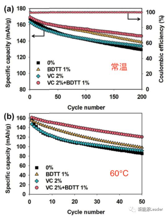 下图为采用几种不同添加剂电解液电池在2.7-4.5V(vs Li/Li+)范围内的0.5C循环曲线,从下图a能够看到提高充电截止电压显著提高了NMC532材料的克容量,添加BDTT的NMC532材料的克容量达到了169.3mAh/g,高于空白电解液对照组的167.3mAh/g,循环200次后添加BDTT和VC的电池的容量保持率比空白组高了11.9%,而在60℃高温条件下,BDTT+VC添加剂对于锂离子电池的循环性能的提升更加明显(如下图b所示),作者认为这主要得益于BDTT在正极形成一层稳定的界面膜,而VC则在负极表面形成一层稳定的界面膜。
