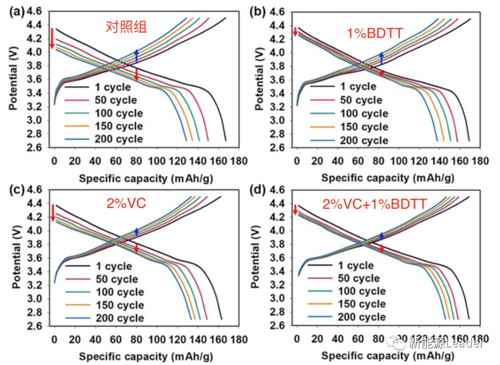 下图为采用不同电解液电池在1、50、100、150和200次循环的充放电电压曲线,从下图a能够看到没有添加剂的电池在循环中放电电压曲线快速衰降,而添加BDTT后的电池循环过程中的放电电压衰降则明显减小,这表明BDTT的加入能够有效的抑制正极界面的副反应,减少正极界面阻抗的增加,从而减少电池在充放电过程中的电压衰降。