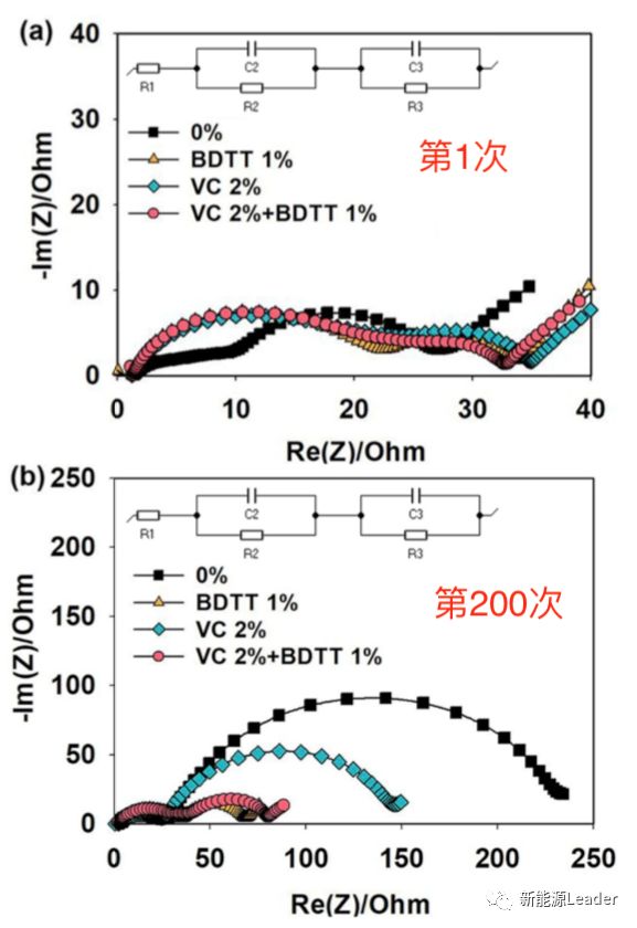 交流阻抗是分析锂离子电池界面阻抗最为有效、最为直观的方法,下图为采用不同电解液的电池的交流阻抗数据,从图中我们能够看到这些电池的交流阻抗图谱主要由两个半圆构成,其中在较高频率范围内的半圆主要反映的是Li+通过SEI膜的阻抗Rf,低频区的半圆则主要反映的是电荷交换阻抗Rct,从下图a能够看到在第一次循环中含有添加剂的电池的SEI膜阻抗要明显高于空白对照组,这主要是由于添加剂促使正负极界面形成了更加稳定的SEI膜,但是我们观察循环200次后交流阻抗图谱(下图b)能够发现,没有添加剂的电池电荷交换阻抗Rct出现了明显的增大,远远高于含有BDTT添加剂的电池,这主要是因为BDTT能够在正极的表面形成一层保护层,从而减少了高电压下正极表面的副反应。