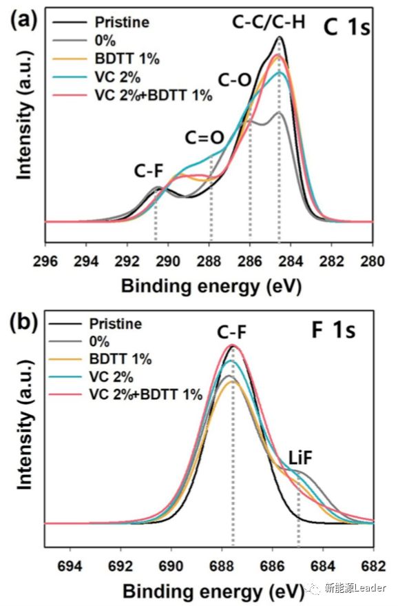 LiF是重要的电解液分解产物,从下图b能够看到在电解液中添加BDTT后正极表面的LiF含量明显要低于空白对照组,这表明BDTT在正极表面形成的界面膜更加稳定,因此能够更好的抑制电解液在正极表面的分解。