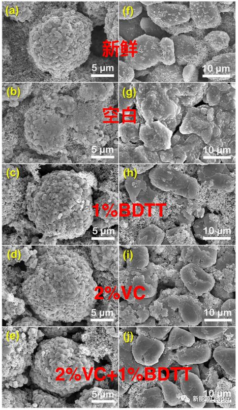 下图为新鲜的NMC532正极和石墨负极,以及采用不同电解液循环100次后的正负极的SEM图,从图中能够看到不同的电解液之间有着显著的区别,从下图b和g我们能够看到空白对照组正负极表面均被大量的电解液分解产物所覆盖。同时我们注意到添加剂能够显著减少电解液在正负极表面的分解,虽然BDTT和VC分别稳定正极和负极界面,但是实际上两种添加剂对改善正负极界面稳定性都有一定作用,正负极表面的电解液分解产物都相对较少。
