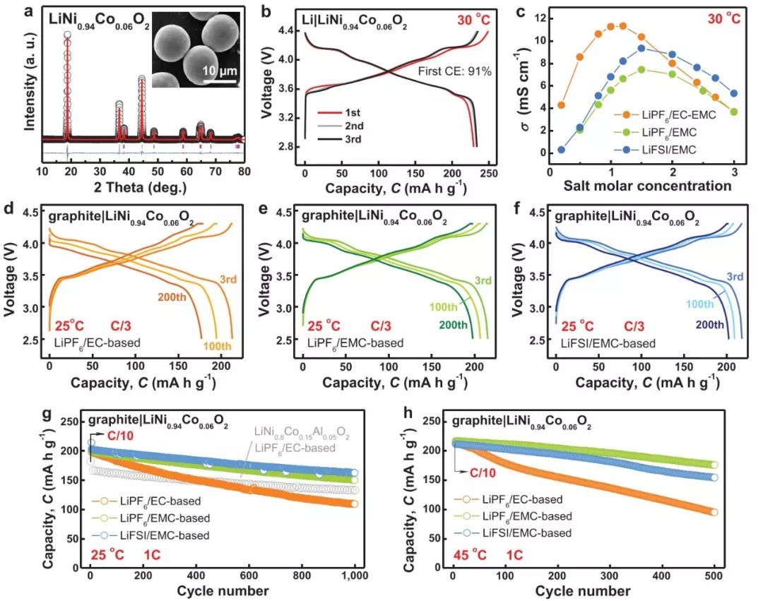 研究中作者使用的正极材料为LiNi0.94Co0.06O2,Ni含量高达0.94。如图1a所示LiNi0.94Co0.06O2颗粒为圆球形,粒径约12 μm。LiNi0.94Co0.06O2的电导率和锂离子扩散系数分别为8.6×10-5 S cm-1和0.5-1.5×10-8 cm2 s-1,高于目前正商业化使用的NCM811材料,且LiNi0.94Co0.06O2的放电比容量高达235 mAh g-1 (图1b)。相较于LiPF6 (1.0 M)/EC-EMC体系电解液,LiPF6 (1.5 M)/EMC和LiFSI (1.5 M)/EMC体系电解液通过提高锂盐浓度可以使得离子电导率更高。但值得注意的是,使用LiFSI为锂盐时有必要加入一定浓度的LiPF6 (0.5 M)以避免LiFSI对集流体所造成的腐蚀。在图1d-h中可以清晰看到使用EMC体系电解液时LiNi0.94Co0.06O2电池的循环性能明显优于使用EC体系电解液。