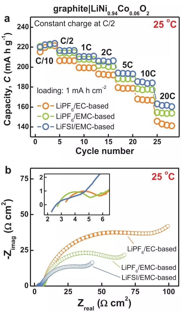 图2. LiNi0.94Co0.06O2电池使用EC体系电解液和EMC体系电解液倍率性能和电化学阻抗谱对比