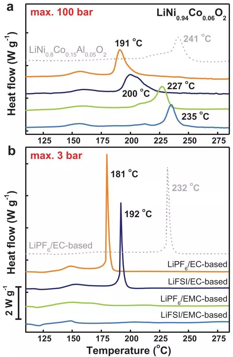 图3. 不同环境压力下充电态LiNi0.94Co0.06O2 (4.3 V vs Li+/Li)同不同体系电解液混合DSC结果对比