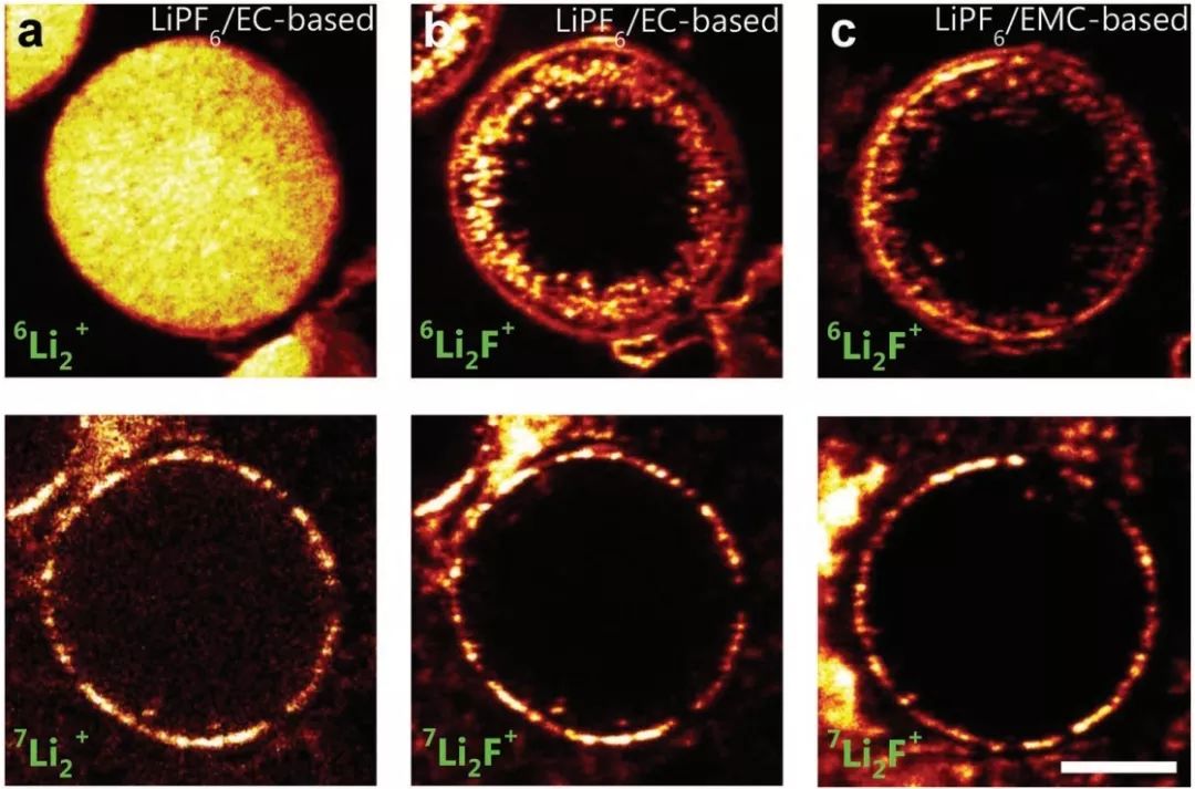 TOF-SIMS (Time-of-Flight secondary ion mass spectrometry)也叫飞行时间二次离子质谱,是将一次离子脉冲束聚焦在样品表面上,在溅射过程中产生二次离子的表面分析技术。分析这些二次离子可以得到有关表面上分子和元素种类的信息。如图4所示,在同样使用LiPF6作为锂盐的条件下,使用EC体系电解液时LiNi0.94Co0.06O2颗粒表面能观察到大量电解液分解后的残余物,而使用无EC的EMC体系电解液时LiNi0.94Co0.06O2颗粒表面的残余物量明显降低。以上结果也表明LiPF6在线性溶剂(如EMC)中有着更好的化学稳定性。