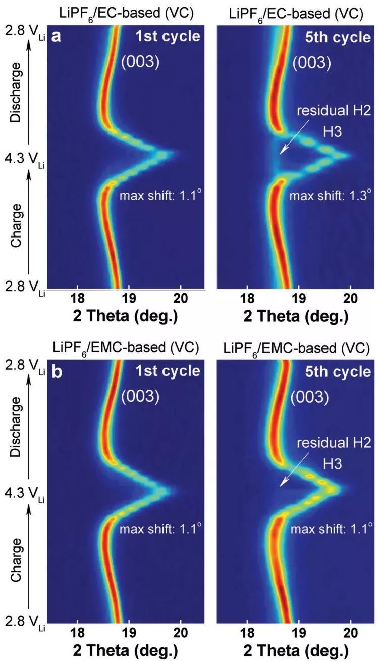 除了分析LiNi0.94Co0.06O2在不同电解液中放置后的表面成分差异外,作者还利用原位XRD对LiNi0.94Co0.06O2在循环过程的结构变化进行了分析。如图5所示,LiNi0.94Co0.06O2在EC体系电解液中循环5周后(003)峰在高电压区出现了显著的分化,而在EMC体系电解液中则未出现以上分化现象,由此表明在EMC体系电解液中LiNi0.94Co0.06O2有着更好的结构稳定性,H2到H3相转变更为困难。