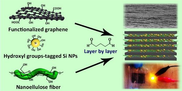 5.Free-Standing Sandwich-Type Graphene/Nanocellulose/Silicon Laminar Anode for Flexible Rechargeable Lithium Ion Batteries; DOI: 10.1021/acsami.8b10066.