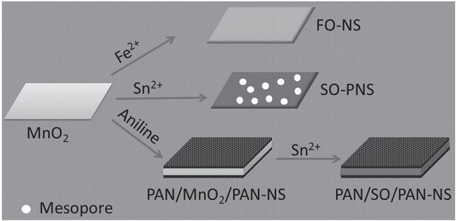 二维纳米片的常规制备方法有两种,即自下而上和自上而下法。Ding等首次采用电流置换法,以δ-MnO2纳米片为模板,制备了金属氧化物纳米片,包括α-Fe2O3纳米片(FO-NSs,厚度:~9.5nm),SnO2介孔纳米片(SO-PNSs,厚度:~12.5nm),三明治状聚苯胺(PAN)/SnO2/PAN纳米片(PAN-SO-PAN-NSs,厚度:17-20nm)。相比于原始δ-MnO2纳米片,α-Fe2O3纳米片出现横向膨胀,而SnO2介孔纳米片出现横向收缩。作为储锂负极时,α-Fe2O3纳米片和SnO2介孔纳米片表现的首次可逆容量分别为1618mAh/g和1064mAh/g。FO-NSs在10A/g大电流密度下循环1000周,容量保持率为80%。超薄的纳米片能有效适应锂离子嵌入/脱出过程的体积变化,缩短扩散路径,提供更多的活性表面。相关文章发表在Small上。