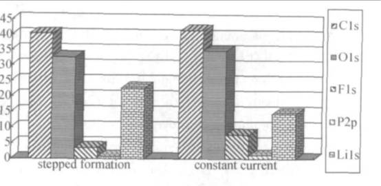 1.阶梯式化成后锂离子电池负极CMS表面锂离子含量要高于恒流式化成,这是因为不同的电流密度下,形成了多种含锂化合物,导致过多的锂含量。