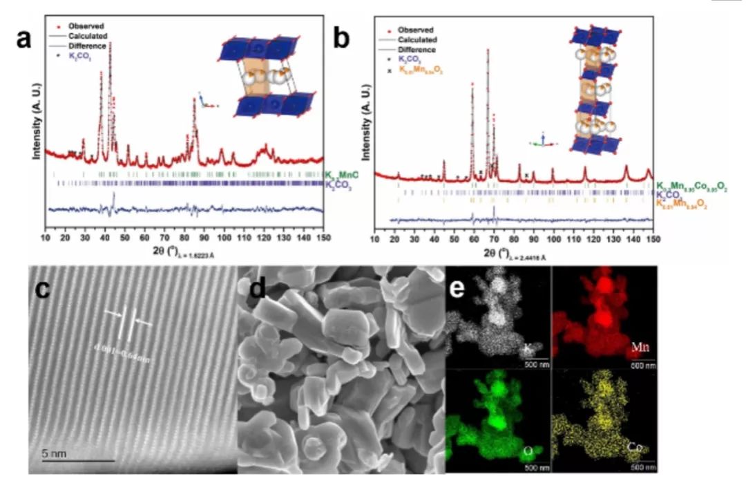 Fig. 1 a)和b)分别是K0.3MnO2和K0.3Mn0.95Co0.05O2的精修中子衍射谱图(NDP); c) K0.3Mn0.95Co0.05O2的STEM图; d) K0.3Mn0.95Co0.05O2的SEM图; e) K0.3Mn0.95Co0.05O2的EDX元素分布图。