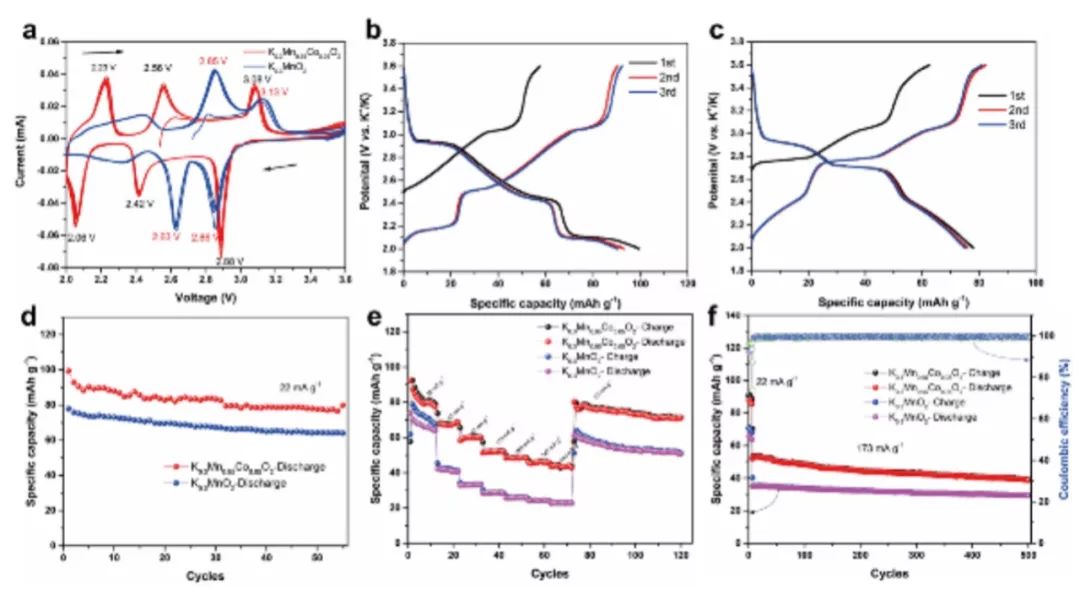 Fig. 2 a) K0.3Mn0.95Co0.05O2和K0.3MnO2在扫速0.1 mV/s下的循环伏安曲线; b) K0.3Mn0.95Co0.05O2的充放电曲线; c) K0.3MnO2的充放电曲线; d) K0.3Mn0.95Co0.05O2和K0.3MnO2的倍率性能; e) K0.3Mn0.95Co0.05O2和K0.3MnO2的长循环性能及库伦效率。