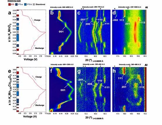 Fig. 3 a-d) 及e-h)分别为K0.3MnO2和K0.3Mn0.95Co0.05O2的原位同步辐射粉末衍射测试结果。