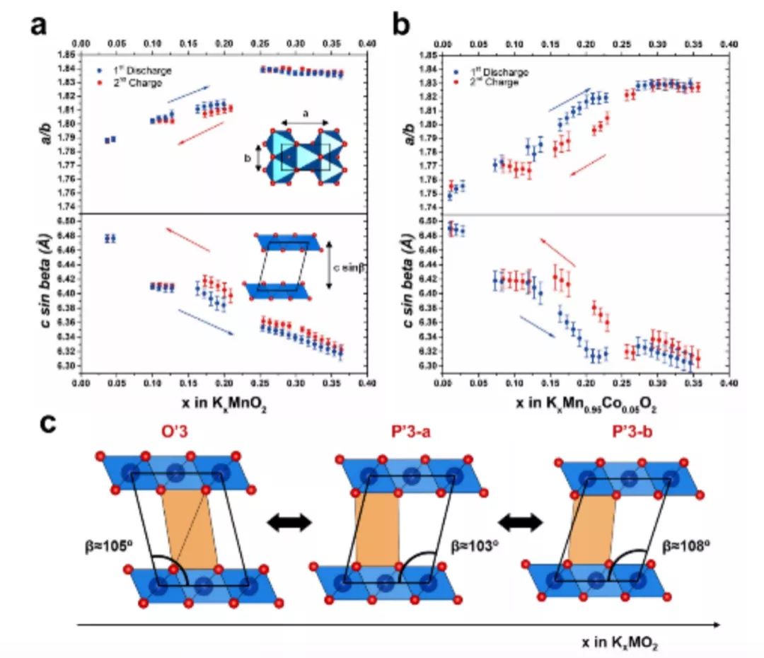 Fig. 4 基于原位同步辐射粉末衍射数据计算得到的晶胞参数: a) K0.3MnO2; b) K0.3Mn0.95Co0.05O2; 及c) 单斜相KxMO2 (M = Mn + Co)在充电过程中(x ≈ 0.1, 0.2和0.35),MO6层的滑移变化示意图。