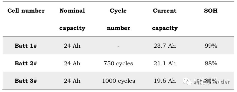 实验中作者采用了三只NCM111/石墨软包电池,电池容量为24Ah,其中1#电池未进行循环,2#电池在45℃下循环750次,3#电池在45℃下循环1000次,电池的基本信息如上表所示。