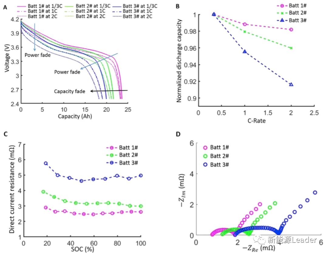 下图a为三只电池在不同倍率下的放电曲线,从图中能够看到随着锂离子电池衰降程度的增加,其电池容量出现了显著的衰降,并且电池极化也明显增加,从下图c也能够注意到随着锂离子电池老化程度的增加,电池的直流阻抗也出现了显著的增加,但是由于直流阻抗的特点,我们无法对不同阻抗类型对直流阻抗增加的贡献进行区分。