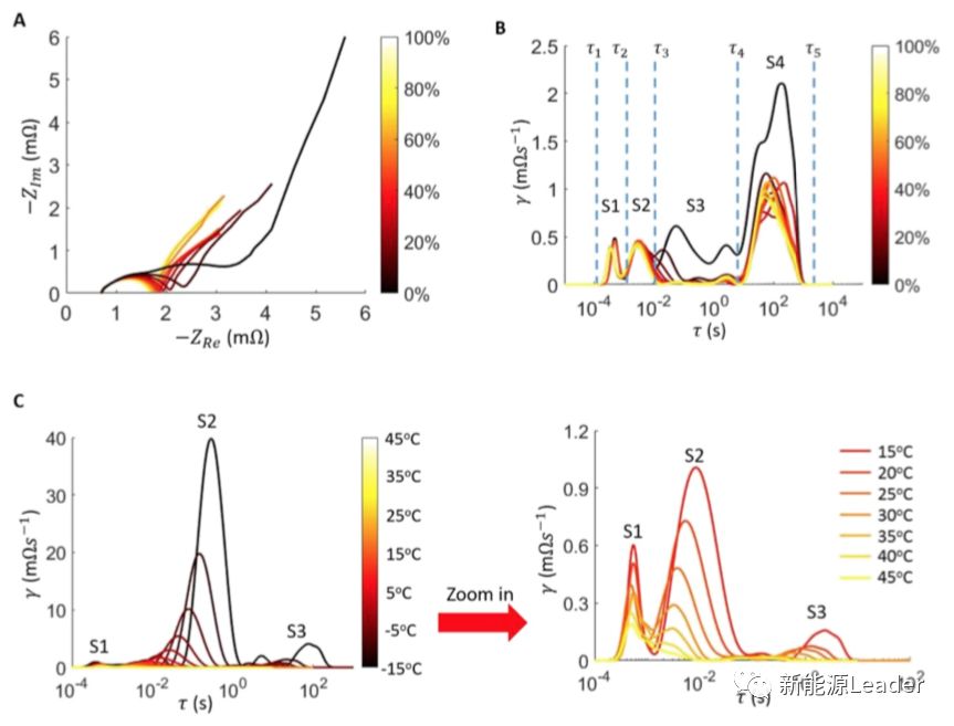 为了进一步确定S1和S2的阻抗类型,作者又对不同温度下电池的DRT进行了分析,从下图能够S1-S3都与温度具有很强的相关性,但是相比于S2,S1的温度相关性比较低,因此作者认为S1主要反应的是接触阻抗,由于S3与SoC之间有密切的关系,因此S3可以认为是电荷交换阻抗Ri2,而S2与SoC关系较弱,与温度关系密切,因此S2为Li+扩散通过SEI膜的阻抗Ri1。