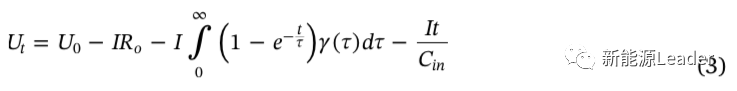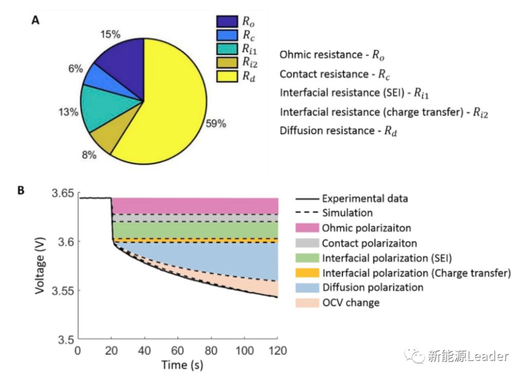 下图展示了锂离子电池中不同阻抗类型对于锂离子电池阻抗的贡献比例(25℃,50%SoC),可以看到Li+的扩散阻抗Rd占比最大,达到59%,随后是欧姆阻抗Ro的15%,然后是Li+在SEI膜中的扩散阻抗Ri1的13%,然后是界面电荷交换阻抗Ri2的8%,最小的为接触阻抗Rc的6%。根据下式3作者计算了在恒流放电的过程中电池中不同阻抗对锂离子电池电压衰降的影响,可以看到欧姆阻抗、接触阻抗和界面阻抗造成的电压衰降在几秒中时间内就已经建立,随后电压的衰降主要是扩散阻抗缓慢建立的过程。