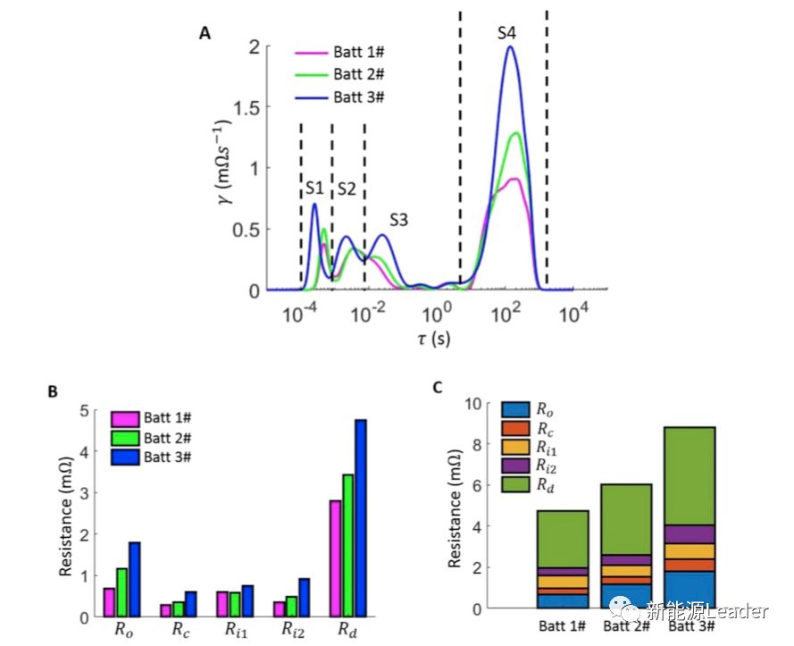 下图a为三只电池的弛豫时间分布曲线,并根据公式2计算了不同阻抗类型的大小,结果如下图b所示,下图c则展示了三只电池的总阻抗的差异,从下图可以看到电池1#阻抗为4.75mΩ,电池2#阻抗为6mΩ,电池3#阻抗为8.8 mΩ,可以看到电池衰降越大则电池的阻抗增加也就越明显。我们对比电池1#和电池3#的阻抗变化,可以看到扩散阻抗Rd增加了1.94 mΩ,SEI膜阻抗Ri1增加了0.15 mΩ,电荷交换阻抗Ri2增加了0.55 mΩ,接触阻抗Rc增加了0.30 mΩ,欧姆阻抗Ro增加了1.10mΩ,分别占阻抗增加的48%、4%、14%、7%和27%。