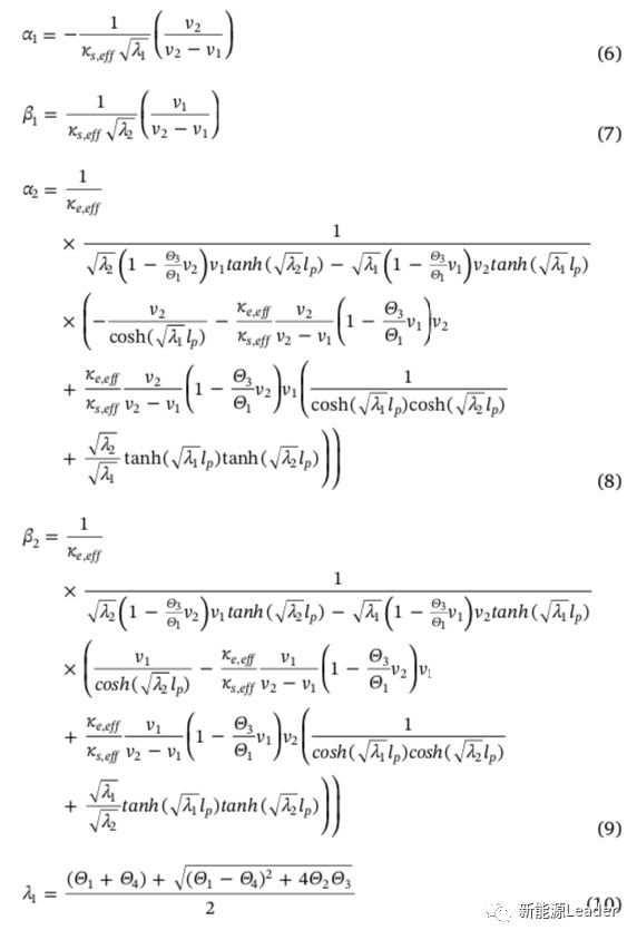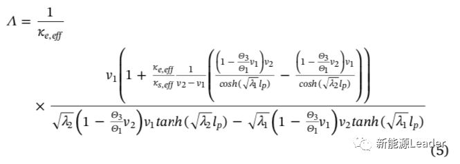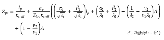从上面的分析不难看出扩散阻抗Rd在锂离子电池阻抗增加中的占比最大,而作者认为低频下Li+的扩散阻抗主要由两部分组成:1)Li+在固相活性物质中的扩散阻抗;2)Li+在电解液中的扩散阻抗,为了实现对这两种扩散阻抗的区分,作者采用了多孔电极模型的方式对电极的阻抗行为进行分析,多孔电极的阻抗模型如下式4所示。