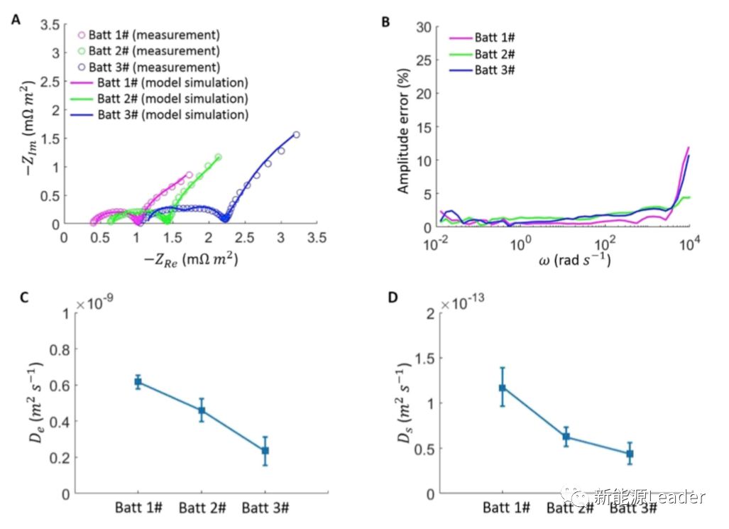 利用上述的多孔电极模型,作者对三只电池的EIS曲线进行了仿真,仿真结果如下图A所示,可以看到仿真结果可以与实验结果完美符合,在大部分的频率范围内误差在5%以内,仅在高频区由于电感的存在使得误差有所增加。