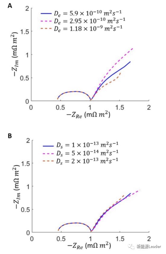 为了分析低频区扩散阻抗的构成,作者在上述模型中分别调节电解液和固相扩散常数(增加1倍和减少一半)看对扩散阻抗的影响,根据下图所示的拟合结果可以看到低频区的扩散阻抗对电解液扩散阻抗的变化更为敏感,因此作者认为扩散阻抗是由液相扩散主导的,但是小编认为由于电解液的扩散系数比固相扩散系数高4-5个数量级,这里液相扩散系数的变化数值是固相扩散的数千倍,自然模型对于液相扩散系数变化更为敏感,但是实际中液相扩散系数是否会有这么大的变化还需要进一步的验证。