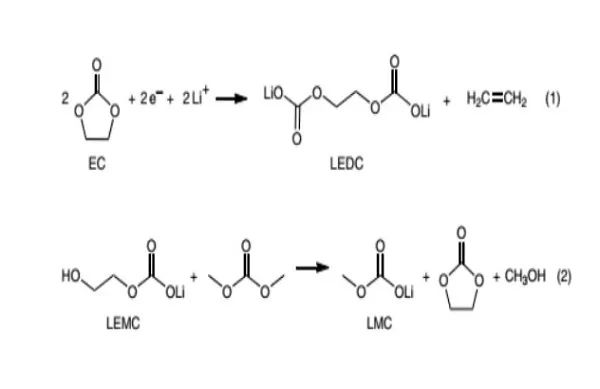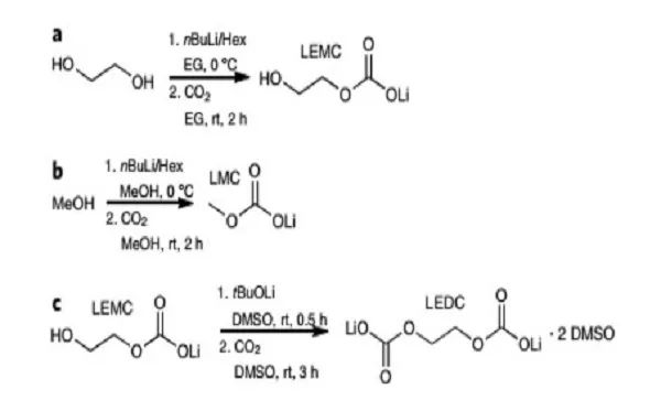 锂离子电池作为最重要的电化学储能器件之一,已广泛的用于便携数码和电动汽车,并且,随着其他电动交通工具如电动船舶和电动飞机,以及大规模储能和能源互联网的发展,未来锂离子电池无疑会得到更加广泛的关注和应用。然而,尽管锂离子电池已经实现量产28年,然而人们对于其中一些关键材料和界面的了解依然有很多不足,甚至是误解。大量的研究表明,在商用的电池材料(层状正极+LiPF6/EC/DMC+石墨负极)体系中,负极表面会在早期的几个循环后生成一层固体电解质界面层(SEI),稳定的SEI具有一定的离子导电性和良好的电子绝缘性,能够拓宽电解液的电化学窗口,隔绝负极不与电解液发生反应,从而保证电池能够稳定循环。可以说,良好的SEI是电池稳定循环的必备条件,因此近些年来不断有研究试图了解其成分和结构信息,人们发现其厚度在10-50nm级别,包含了无机成分和有机成分。其中无机成分主要来自锂盐的分解,而有机成分则被认为起始于电解质中的EC溶剂在0.8V左右开始还原反应,其反应式一般认为式1所示,为单电子电荷转移反应。同时,通过大量谱学的表征手段,将SEI的谱图数据和人工合成物对比,人们发现,SEI中主要的有机成分为LEDC(二碳酸乙烯锂)。然而,之前LEDC的合成路径并不在溶液中进行,使得LEDC生成的动力学过程较慢,且可能无法得到纯净的LEDC,不利于作为标准成分和SEI谱图比较,甚至可能带来SEI成分认知上的误解。