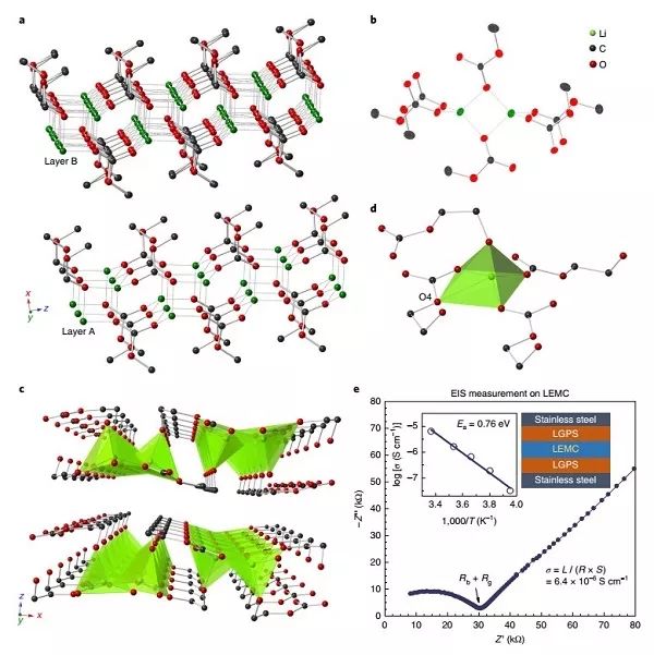 进一步,作者采用单晶XRD衍射对所合成的LDMC和LMC的结构进行表征,如图2所示。其中LMC为单斜晶系,P21/C空间群,两个LMC分子位于不同的分子层上。其中一层为完全有序结构,另一层则为部分无序结构,沿x轴有序排列,形成“有序-无序-有序……”的周期排列结构。LEMC为正交晶系,Pbcn空间群,每个对称单元内包含一个分子。其结构包含两层LEMC分子沿z轴排列,与LMC的结构不同,LEMC的分子结构存在能使锂离子传输的通道,如图2所示,而这种独特的结构可能对其锂离子传输特性产生一定的影响。进一步,作者采用电化学阻抗谱,测量了LEMC,LMC和LEDC的离子电导率。为了避免可能的质子电导的贡献,在样品两次压上LGPS锂离子导体作为阻塞电极,测得LEMC的离子电导率为6 x 10-6 S/cm级别,属于良好的离子导体,和薄膜电池中采用的固态电解质LiPON基本处于同一水平。而LMC和LEDC的离子电导率低于仪器可以测试的范围,可以认为其基本没有离子电导(< 10-9 S/cm)。图2:a)LMC的分子结构,其中A为有序层,B层为无序层;b)在LMC中Li-O的四面体配位;c)LEMC的分子结构;d)LEMC中的Li-O键合;e)Au / LGPS / LEMC / LGPS / Au构型的阻塞电极阻抗谱测试。