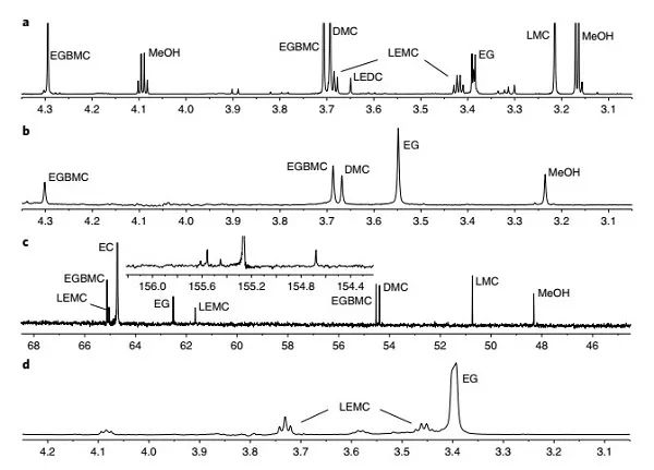 以往的研究受限于SEI的生成物量太少而无法进行精确表征,为了进一步确定电极中SEI的成分,作者制备了包含400 mg电极的大极片,组装电池并分别在LiPF6/EC/DMC,LiPF6/DMC,以及LiPF6/EC三种电解液中进行首周充放电测试。作者发现,只有在EC溶剂存在的体系中,在首周充放电过程中0.8 V处存在不可逆的电压平台。接下来,作者将获得的SEI膜溶解在DMSO-d6-DCl-D2O溶剂中进行NMR表征。作者发现,在EC/DMC溶剂的电解液中,LMC,LEDC和LEMC都被检测到,而在EC溶剂的电解液中则只有LEMC能被检测到。结合前面的实验,作者推测,LMC可能并不是电化学过程的产物,而是EC溶剂被还原后的产物进一步与DMC反应的副产物。其反应过程如式2所示。图3:石墨负极表面SEI的溶液NMR表征:a-c) 为在LiPF6/EC/DMC循环,a为DMSO-d6溶液测试的氢谱,b为DCl-D2O溶液测试的氢谱,c为DMSO-d6中测试的13C谱;d为在LiPF6/EC电解液中循环的DMSO-d6测试的氢谱。