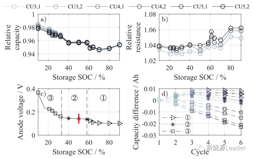 锂离子电池存储过程中由于界面副反应的存在,也会导致锂离子电池内阻的升高,从下图b我们能够看到在SoC低于58%时,电池内阻增加了4%,当电池SoC高于58%时电池内阻增加显著增多,最高增加了6%。