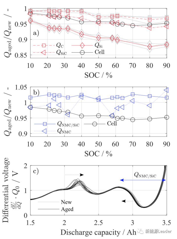 为了分析不同SoC状态下存储锂离子电池衰降的原因,作者采用了电压差分曲线的方法对锂离子电池进行了分析,电压差分曲线是分析锂离子电池内部反应机理的有效手段,我们从下图b中的负极电压差分曲线中能够看到石墨的主峰在2.17Ah附近,在此处负极发生了LiC12到LiC6的相变,同时我们能够看到由于负极加入部分的Si元素,因此我们在0%-15%SoC之间观察到了Si形成的特征峰,根据这些特征峰的位置作者在下图c中标示出了Si成分的容量和石墨成分的容量。