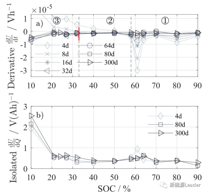 为了表征不同SoC状态下锂离子电池的自放电速率,作者在这里引入了自放电电流的概念,可以采用下式进行计算,式中第一项为容量与电压之间的关系曲线的斜率,第二项为在存储过程中电压随时间变化曲线的斜率,两者相乘就能够得到锂离子电池的自放电电流。