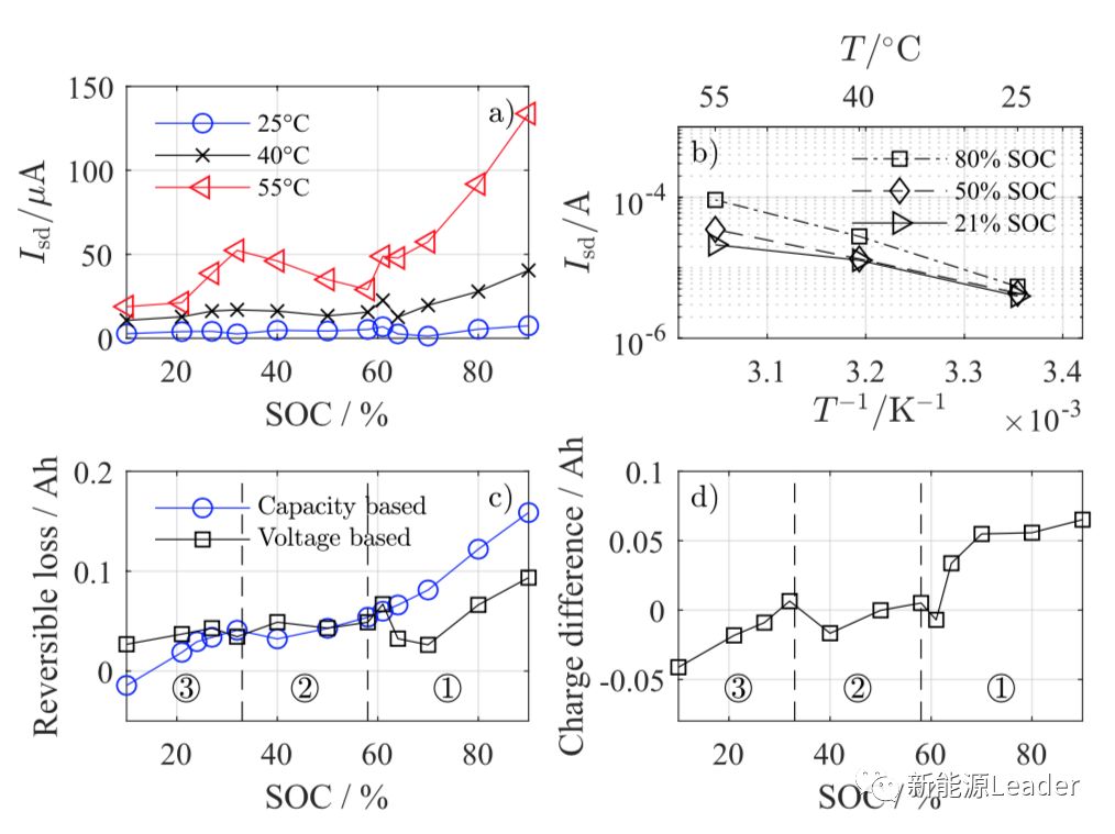 下图a为作者计算得到了锂离子电池在不同SoC、不同温度下的自放电电流,从图中我们能够注意到电池的自放电电流与温度之间存在密切的关系,例如同样在90%SoC状态下,55℃时电池的自放电电流达到135uA,但是25℃下自放电电流仅为2-4.5uA,相当于每个月损失0.04%-0.1%的容量,这一现象表明存储过程中的自放电更多是源于界面的一些副反应,而不是我们通常认为的软短路。下图c是作者根据自放电电流计算得到的容量衰降和实际测得的容量衰降数据,从图中可以看到在较低的SoC下,自放电电流的结果偏高,而在极高的SoC下自放电电流方法得到的结果偏低。