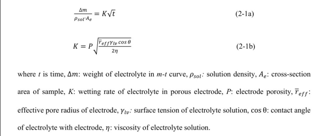电极中的电解质润湿过程是由毛细管力驱动的自发液体吸附过程,忽略惯性和重力的影响,因此,电极中电解液重量随时间变化的关系可用修正的 Lucas-Washburn 方程描述、即公式 2-1a 和 2-1b 。
