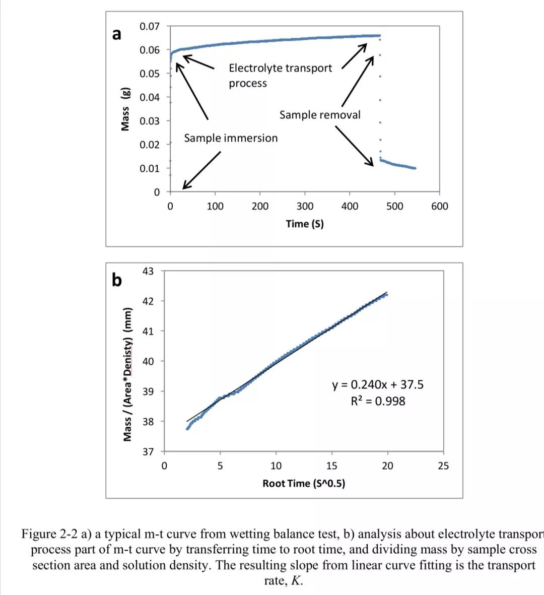 对电解液浸润阶段的曲线进行分析,如图2-2b所示。根据公式2-1a,横坐标为时间的平方根,纵坐标为质量/(样品横截面积·电解液密度),作图。对曲线进行线性拟合,直线斜率即为电解液浸润速率K。